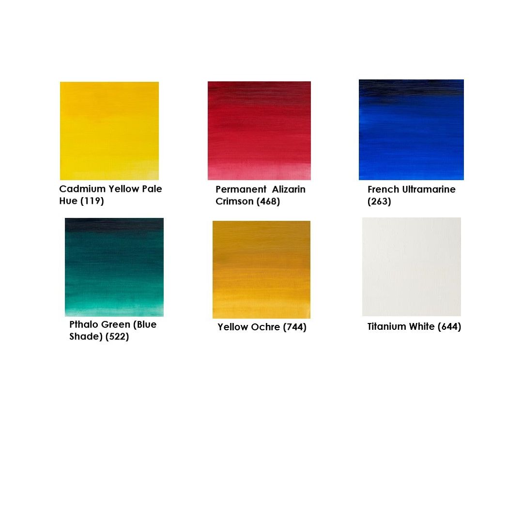 Set contains 6 tubes of 37ml Artisan Water MOC - Colours Included - Cadmium Yellow Pale Hue, Permanent Alizarin Crimson, French Ultramarine, Phthalo Green (Blue Shade), Yellow Ochre and Titanium White
