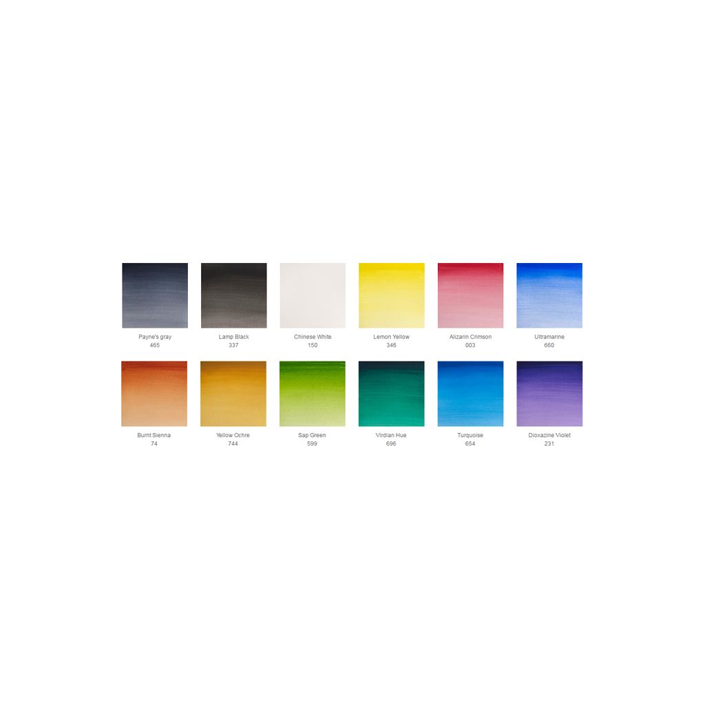 Colours Included - 12 x Cotman watercolours: Payne's Gray, Lamp Black, Chinese White, Lemon Yellow, Alizarin Crimson, Ultramarine, Burnt Sienna, Yellow Ochre, Sap Green, Viridian Hue, Turquoise, Dioxazine Violet