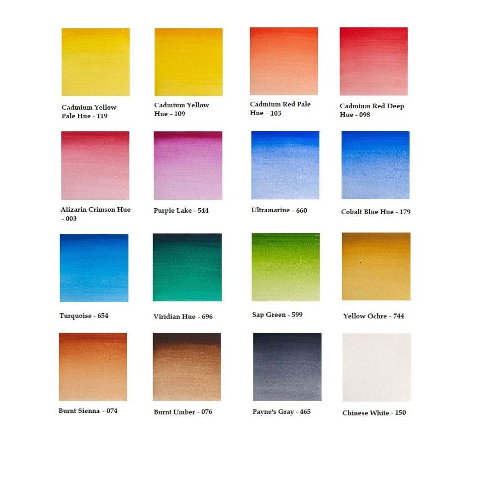 This high quality, light weight plastic set contains:1 x Pocket brush 1 x Kneaded eraser 1 x Pencil, 16 x Cotman Watercolour half pans: Cadmium Yellow Hue, Cadmium Yellow, Rouge Cadmium Pale Hue, Cadmium Deep Red, Purple Lake, Cobalt Blue, Ultramarine, Cerulean Blue, Emerald Green, Sap Green, Yellow Ochre, Burnt Sienna, Burnt Umber, Payne's Grey, Chinese White.