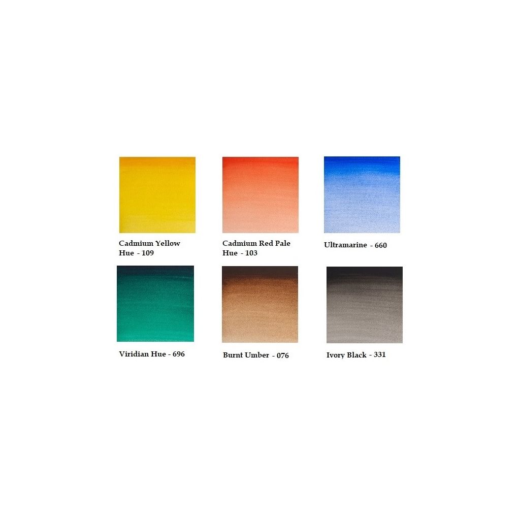 Set Contents - Cadmium Yellow Hue, Cadmium Red Pale Hue, Ultramarine, Viridian Hue, Burnt Umber, Ivory Black