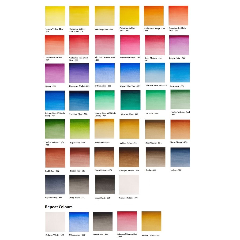 Set Includes 45 Assorted Cotman Water Colour half pans, with integral palette - Colours Included - Alizarin Crimson Hue, Burnt Sienna, Burnt Umber, Cadmium Orange Hue, Cadmium Red Hue, Cadmium Red Deep Hue, Cadmium Red Pale Hue, Cadmium Yellow Hue, Cadmium Yellow Pale Hue, Cerulean Blue Hue, Chinese White, Cobalt Blue Hue, Dioxazine Violet, Emerald, Gamboge Hue, Hooker's Green Dark, Hooker's Green Light, Indian Red, Indigo, Intense Blue (Phthalo Blue), Intense Green (Phthalo Green), Ivory Black, Lamp Black, Lemon Yellow Hue, Light Red, Mauve, Payne's Gray, Permanent Rose, Prussian Blue, Purple Lake, Raw Sienna, Raw Umber, Rose Madder Hue, Sap Green, Sepia, Turquoise, Ultramarine, Vandyke Brown , Viridian Hue ,Yellow Ochre