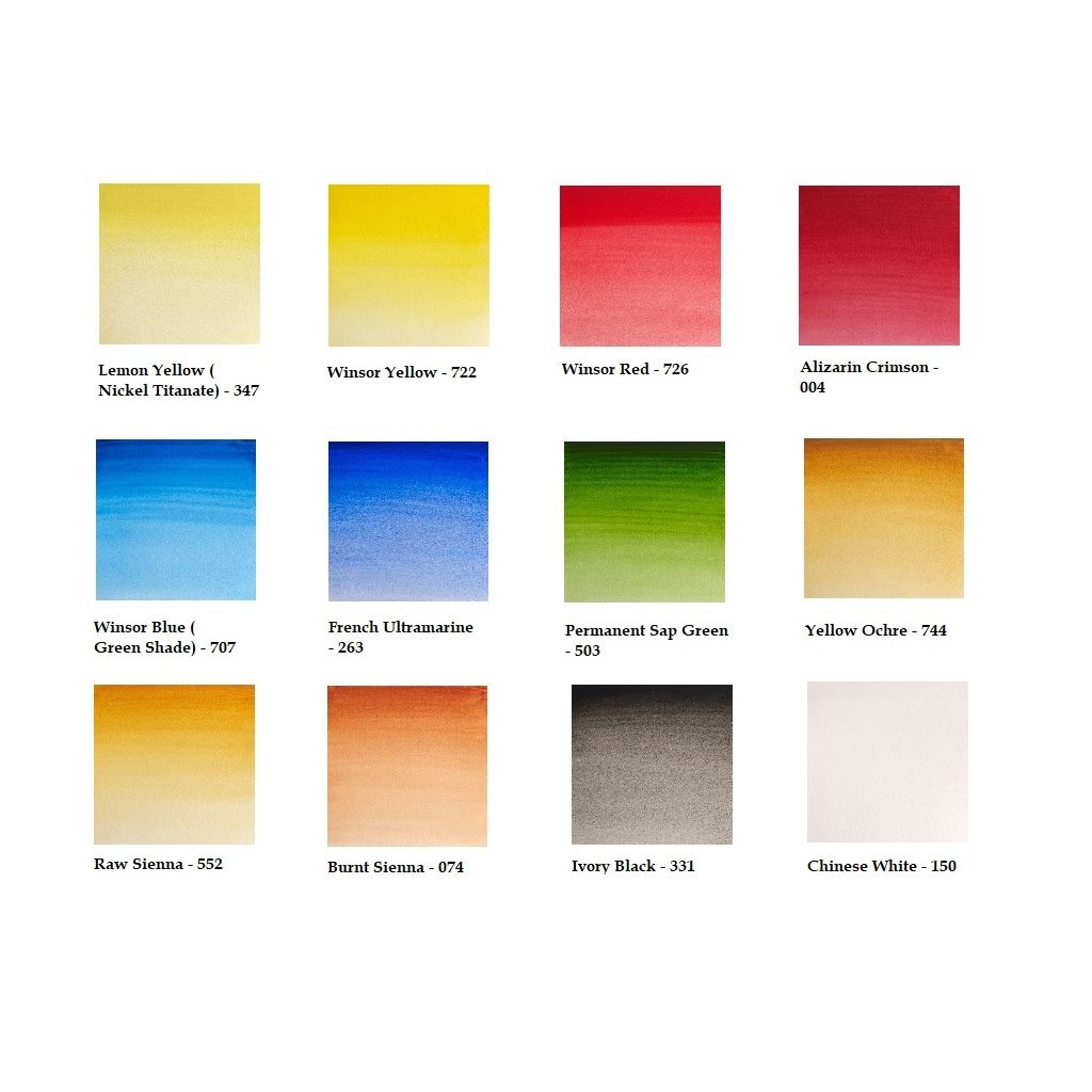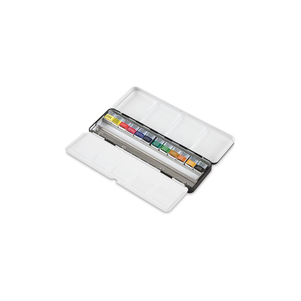 A lightweight black enamelled box containing 12 assorted Professional Watercolour half pans with space for an additional 12 colours. Includes: Winsor Yellow, Lemon Yellow (Nickel Titanate), Winsor Red, Permanent Carmine, French Ultramarine, Prussian Blue, Winsor Green (Blue Umber), Permanent Sap Green, Yellow Ochre, Burnt Sienna, Raw Umber, Ivory Black.