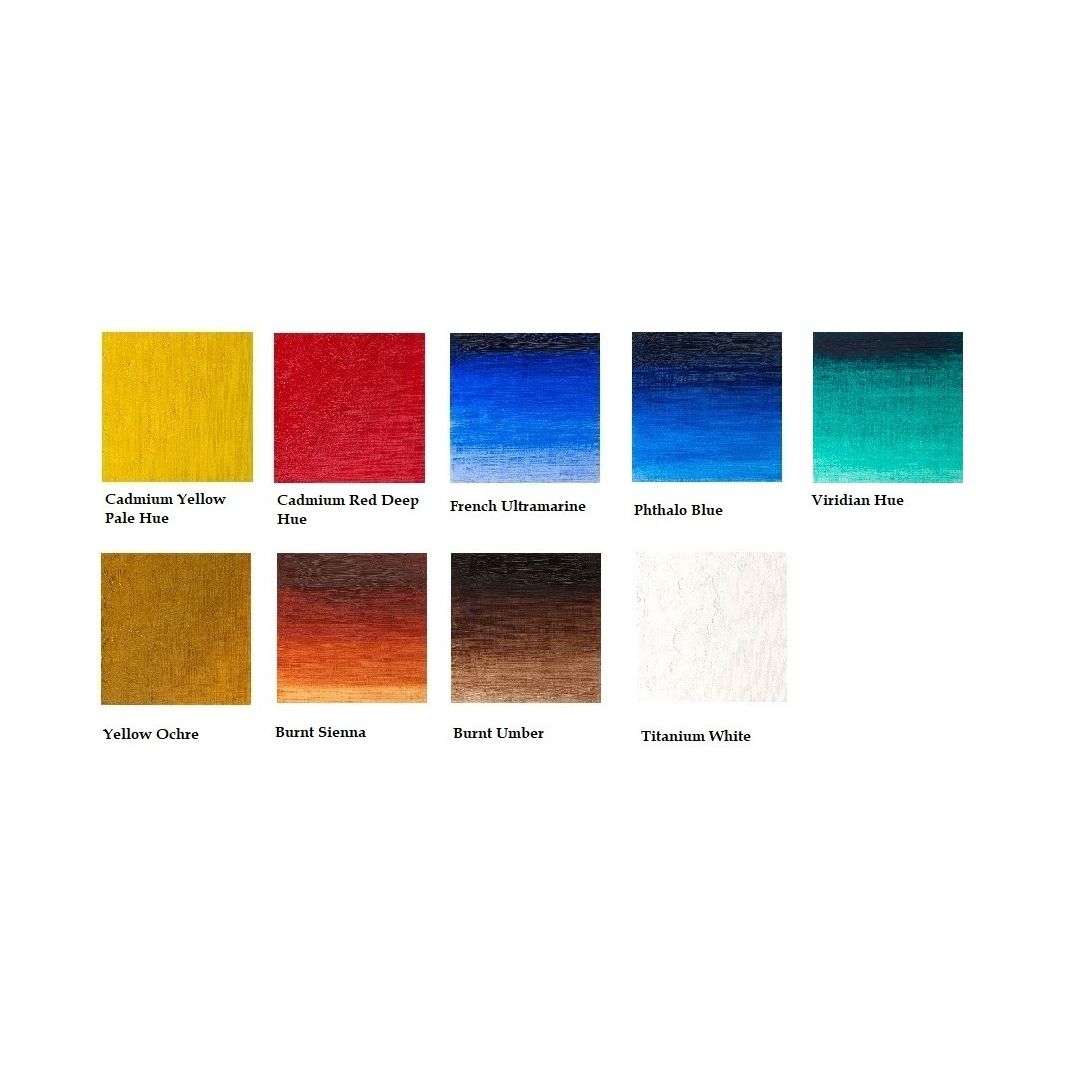 Studio Set- Set Contents - 37ML- Titanium White, 75ml- Liquin Original Painting Medium, Winton Brush No 2, Winton Brush No 4, 8 x 21ML- Cadmium Yellow Pale Hue, Cadmium Red Deep Hue, French Ultramarine, Phthalo Blue, Viridian Hue, Yellow Ochre, Burnt Sienna, Burnt Umber